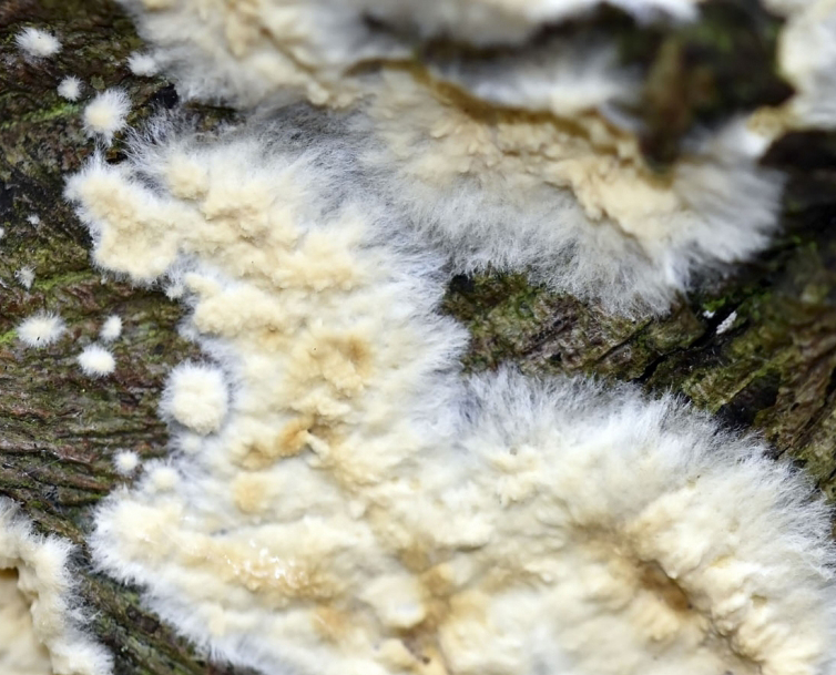 Dans sa manière de se développer, le coniophore lignivore s’infiltre dans le bois par un réseau de filaments mycéliens (lui-même composé d’hyphes), caractéristique commune aux champignons de ce genre. À l’extérieur du bois, les hyphes apparaissent et se mélangent. En résulte une étrange boule/agglomération de filaments cotonneux jaunâtres, un spectacle bien curieux mais qui ne trompe cependant pas.